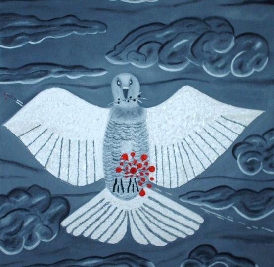 A contemporary piece where paint has been layered in washes and added in clumps in certain areas.